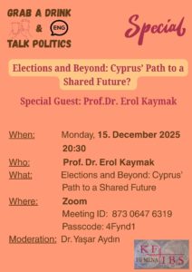 - 5. Dezember 2025 (Fr.): Hiermit weisen wir auf die nächste Online-Veranstaltung der KFIBS-Forschungsgruppe „Naher/Mittlerer Osten und Nordafrika“ (FG 3) im neuen KFIBS-MENA-Format „Grab a Drink & Talk Politics“ hin, die am 15. Dezember (Mo.) abends ab 20.30 Uhr startet. Das Veranstaltungsthema diesmal lautet wie folgt: „Elections and Beyond: Cyprus’ Path to a Shared Future?“. Wir werfen mithilfe von Prof. Dr. Erol Kaymak, Professor für Internationale Beziehungen an der Eastern Mediterranean University (EMU), einen Blick auf die Wahlen im Norden des Inselstaates Zypern. Aber damit nicht genug: Auch darüber hinausgehende relevante Aspekte werden bei dem Online-Event beleuchtet. Zudem wird der Frage nachgehen, ob es vielleicht doch einen Weg gibt, um eine geteilte Zukunft zu ermöglichen. Wie gewohnt wird es wieder einen Impulsreferat geben, bei dem dann einzelne Akzente von dem genannten Referenten und von unserem Gast des Abends gesetzt werden, die er für besonders bedeutsam hält. Anschließend werden wir mit ihm in den Austausch treten und über einige erörterungswürdige Punkte diskutieren. Moderator dieses virtuellen Events ist Sozialwissenschaftler Dr. Yaşar Aydın, zugleich Sprecher der KFIBS-MENA-Forschungsgruppe. Wer dabei sein möchte, ob nun KFIBS-Mitglied oder nicht, ist herzlich dazu eingeladen und kann sich bei der KFIBS-FG-Kollegin Victoria Qassem unter victoria.qassem@kfibs.org registrieren lassen. Wir freuen uns über euer Interesse am Veranstaltungsthema und auch über eure Fragen!