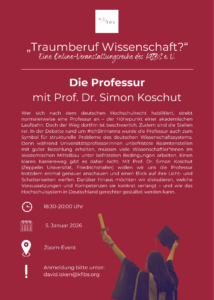 - 5. Januar 2026 (Mo.): Heute weisen wir nun auch auf unserer Website darauf hin, dass die vierte Zoom-Veranstaltung im Rahmen der KFIBS-Online-Informationsreihe „Traumberuf Wissenschaft?“ am Abend ab 18.30 Uhr stattfinden wird. Diesmal beschäftigen wir uns mit dem Thema „Die Professur“. Dabei werfen wir einen nüchternen Blick auf den durchaus beschwerlichen Weg zur Erlangung einer Professur oder eines Lehrstuhls in der heutigen Zeit. Hierzu haben wir als „Gast des Abends“ Prof. Dr. Simon Koschut eingeladen, der nach seiner Habilitation im November 2015 bis zum Antritt des Lehrstuhls für Internationale Sicherheitspolitik an der Zeppelin Universität in Friedrichshafen am Bodensee im Januar 2022 eine wahre Odyssee an verschiedenen Zwischenstationen absolvieren musste, bevor er sich ganz offiziell „Professor“ nennen durfte und sich damit seinen Traum von einer akademischen Karriere erfüllen konnte. Moderiert wird die virtuelle Veranstaltung erneut von Dr. Sascha Arnautović (KFIBS-Vorsitzender) und David Isken (KFIBS-Mitgliederbetreuer). Neben KFIBS-Mitgliedern haben auch externe Interessierte die Möglichkeit, an diesem Online-Event kostenfrei teilzunehmen. Um kurzfristige Anmeldung unter david.isken@kfibs.org wird gebeten. Nach erfolgter Registrierung erhält jede Teilnehmerin und jeder Teilnehmer den für die vierte Veranstaltung der zuvor genannten Reihe vorgesehenen Zoom-Einwahllink. Das KFIBS-Veranstaltungsteam freut sich auf einen spannenden Abend und einen gehaltvollen Austausch mit allen Teilnehmenden!